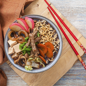 O Ramen é uma suculenta sopa de macarrão com muitos ingredientes como pedaços de carne e legumes. Ele é consumido bem quente.