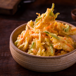O Tempura consiste em tiras bem finas de legumes, vegetais e frutos do mar misturados a uma massa bem fina e fritos.