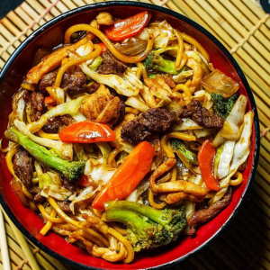 O Yakisoba consiste em fritar o macarrão com pedaços de carne de frango e bovina, juntamente com uma variedade de legumes.