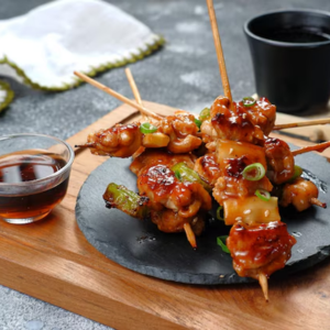 O Yakitori são pedaços de frango e miudezas, colocados em um espeto e grelhados na brasa de carvão vegetal.